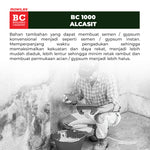 BC - 1000 Alcasit bahan tambahan yang dapat membuat semen/gypsum konvensional menjadi seperti semen/gypsum instan. Memperpanjang waktu pengadukan sehingga memaksimalkan kekuatan dan daya rekat, menjadi lebih mudah diaduk, lebih lentur sehingga minim retak rambut dan membuat permukaan acian/gypsum menjadi lebih halus.