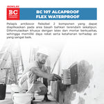 BC – 107 Alcaproof Flex Waterproof pelapis antibocor fleksibel 2 komponen yang dapat diaplikasikan pada area basah bahkan terendam sekalipun. Diformulasikan khusus dengan latex and mortar berkualitas, sehingga memiliki daya rekat serta ketahanan terhadap air yang sangat baik.